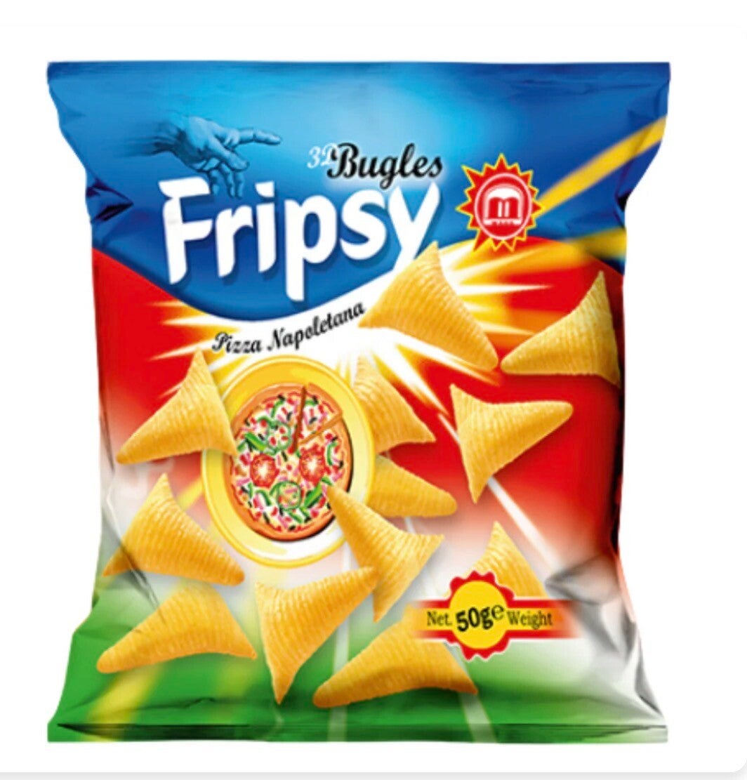 Die Fripsy 3D Bugles Pizza Napoletana bringen italienisches Flair direkt in deinen Snack-Moment! Die knusprigen, dreieckigen Mais-Snacks überzeugen mit einem intensiven Pizza-Geschmack nach klassischer Napoletana – würzig, leicht tomatig und mit feinen Kräuternoten.